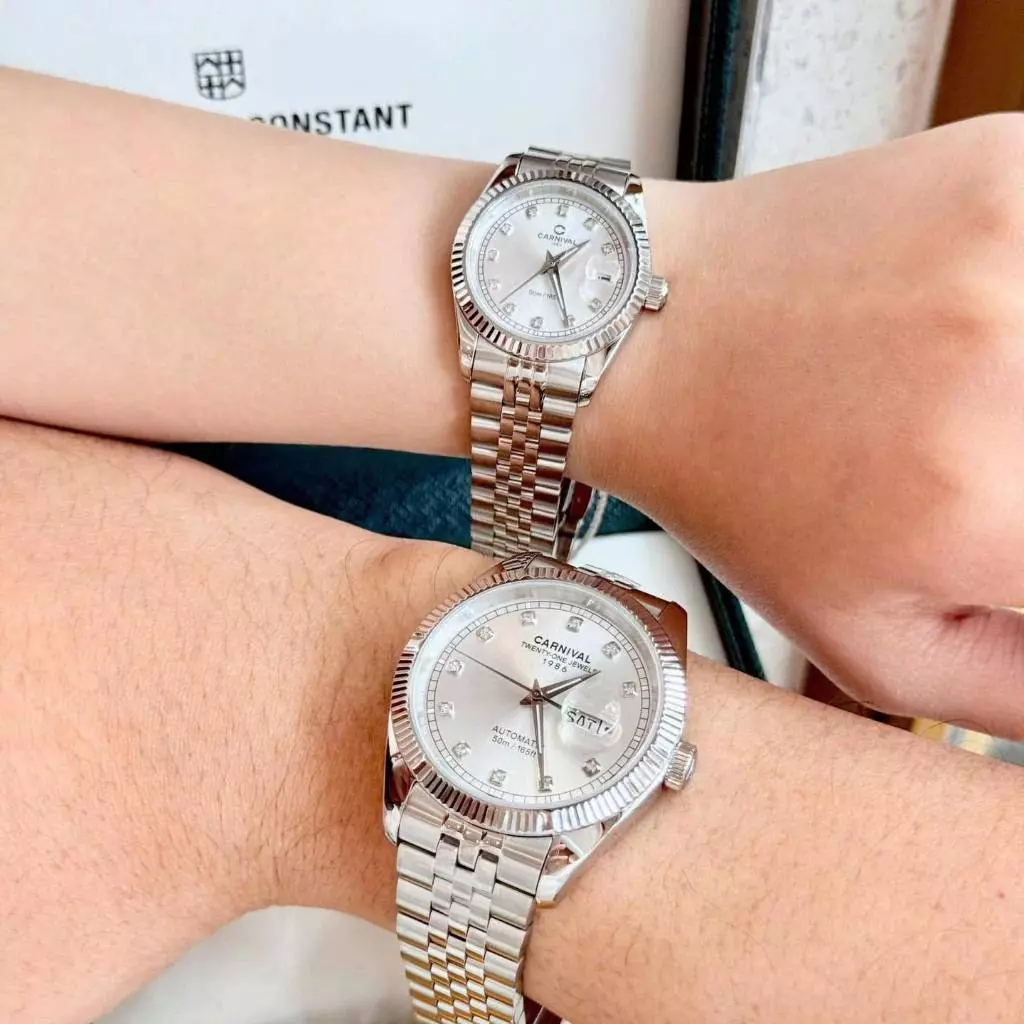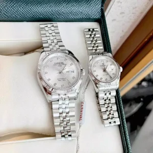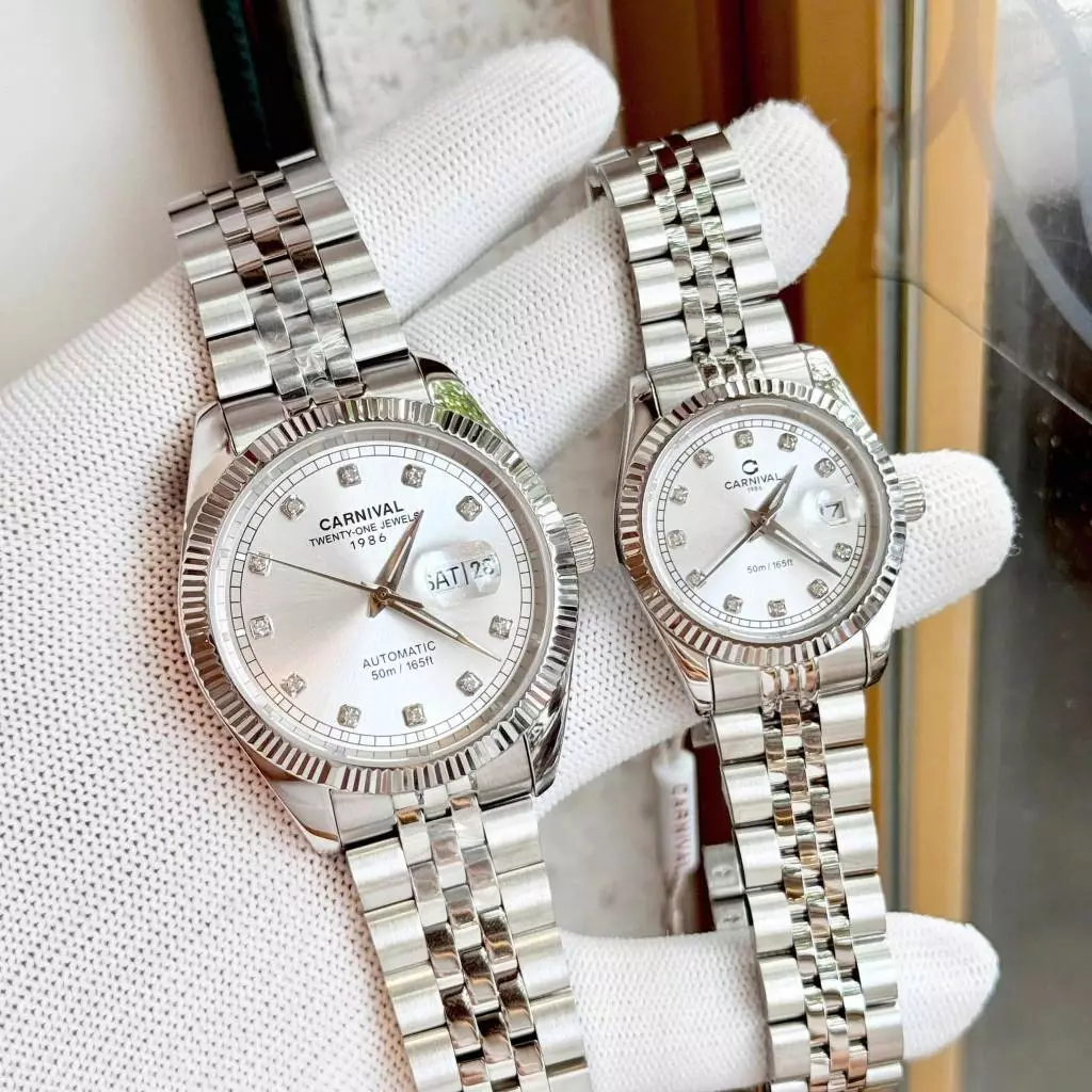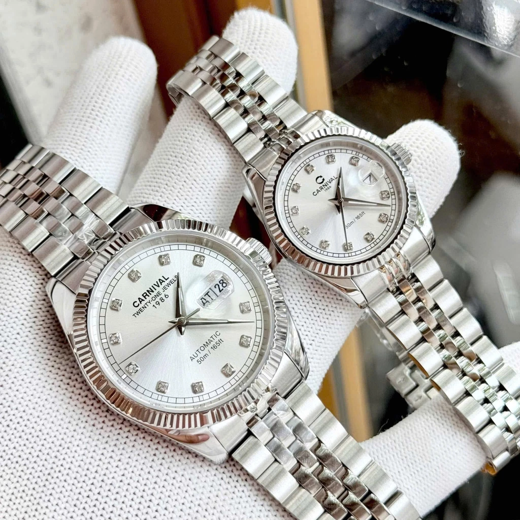 Đồng hồ đôi nam nữ chính hãng Carnival 8131 8131L 8131 8131G dây thép trắng máy cơ mặt kính sapphire