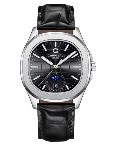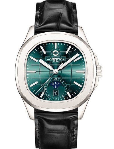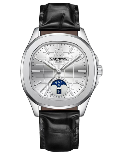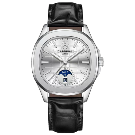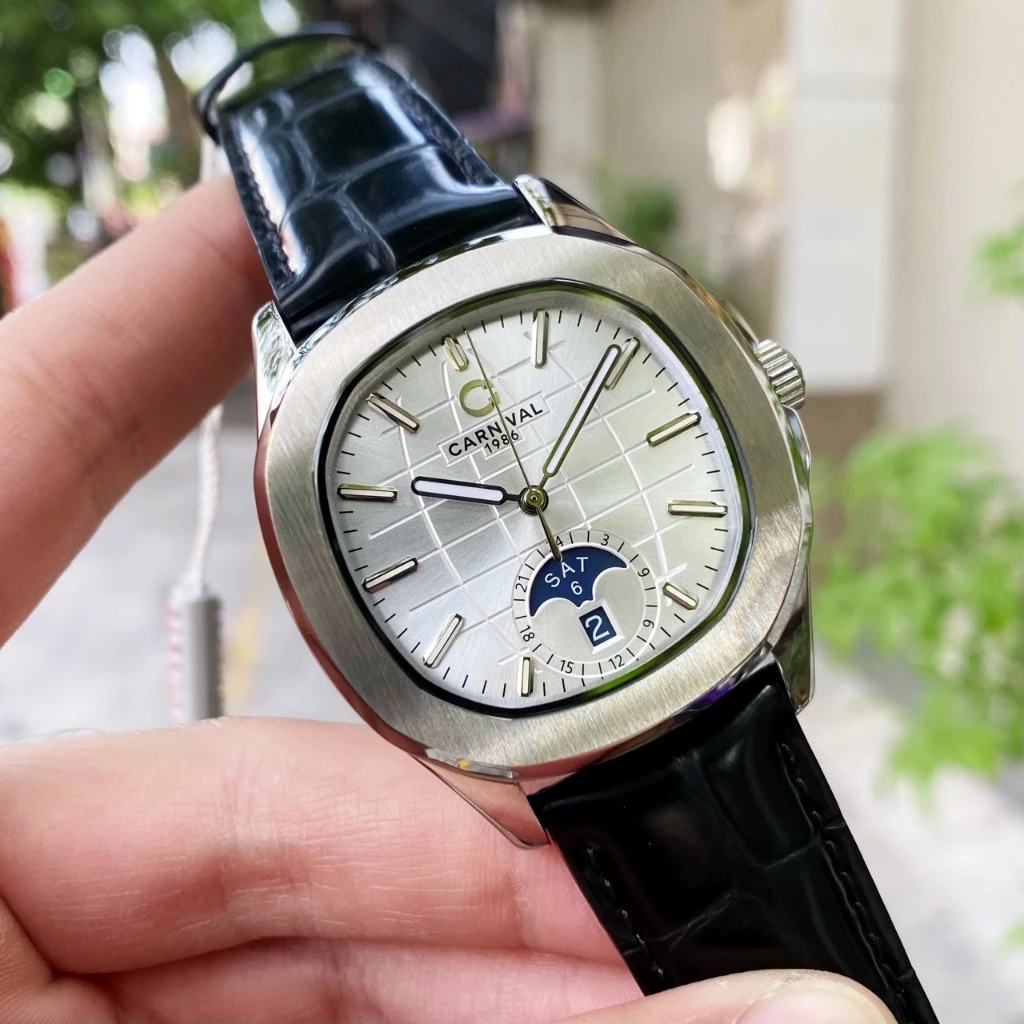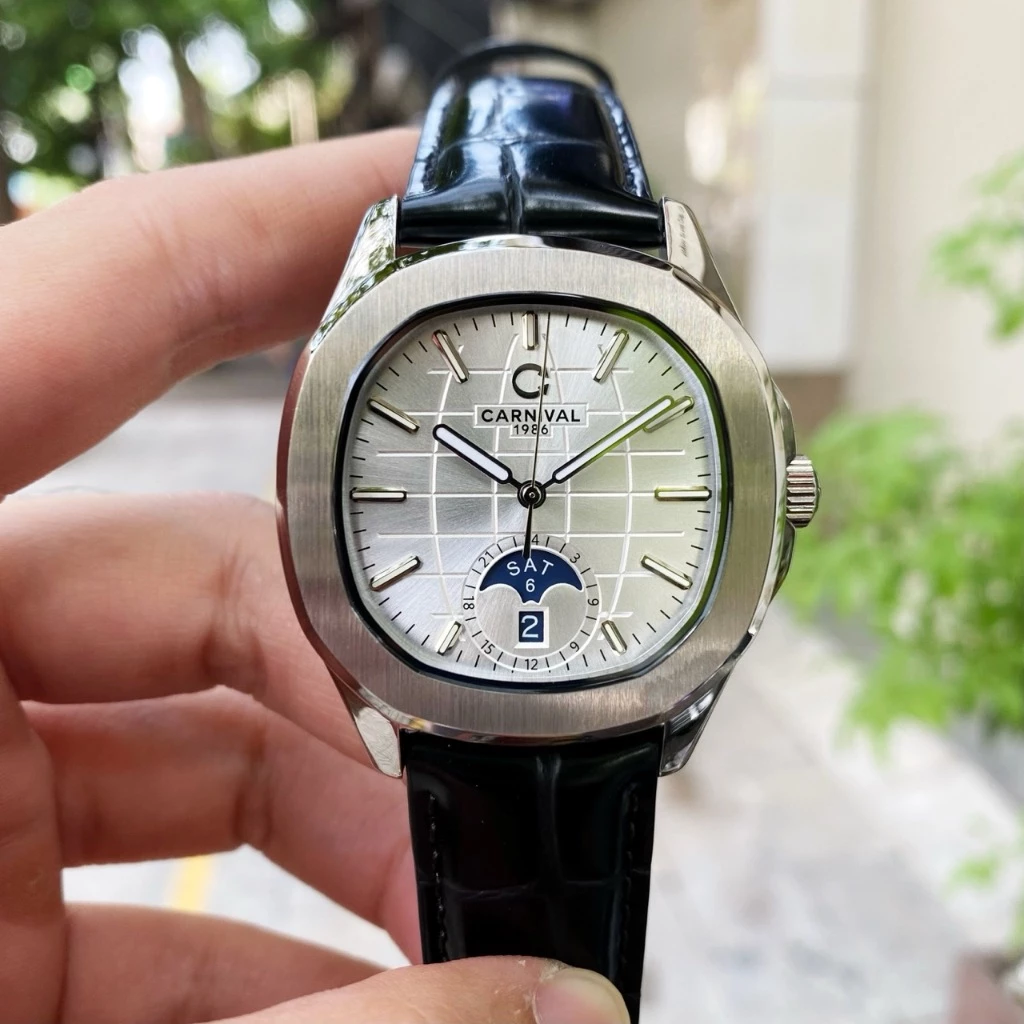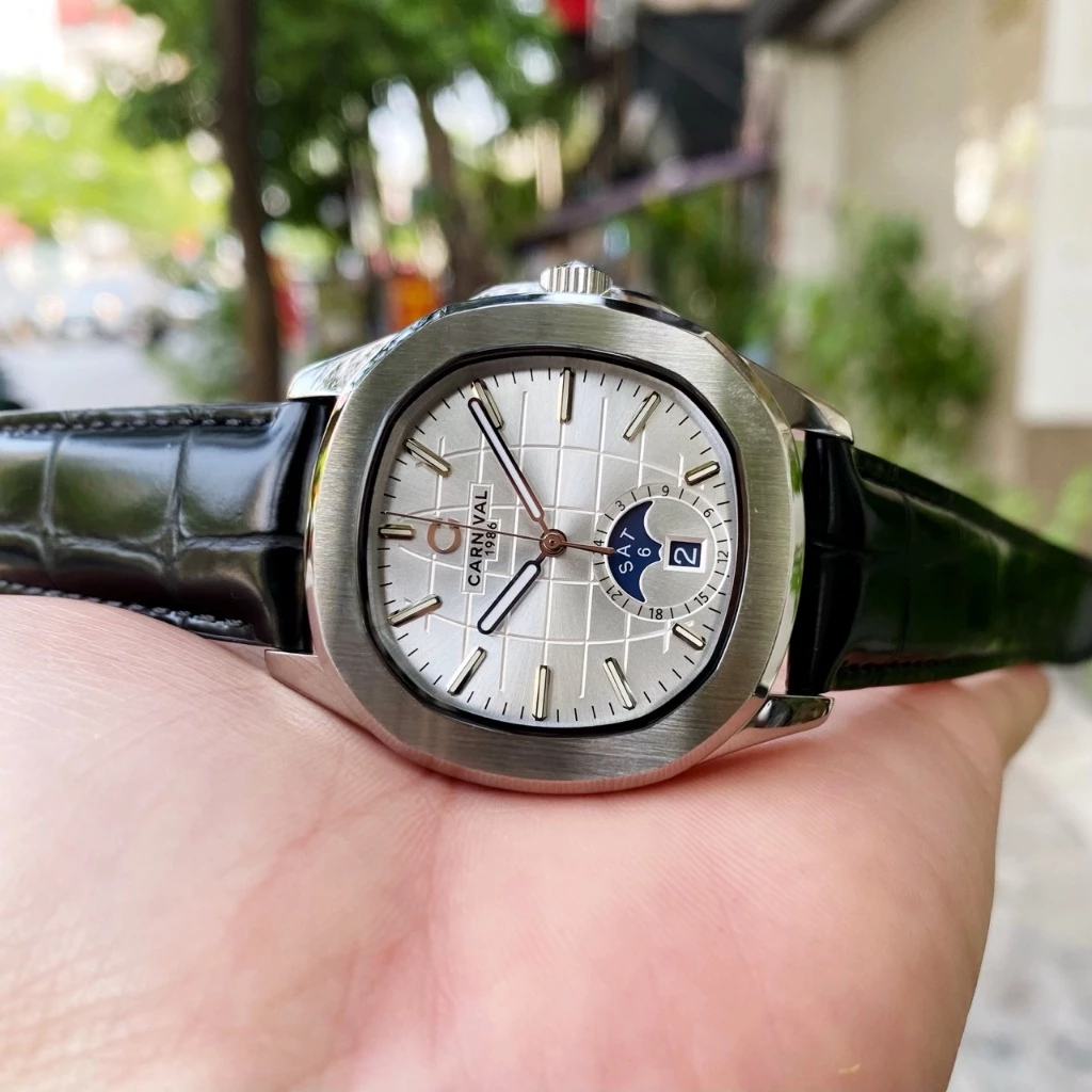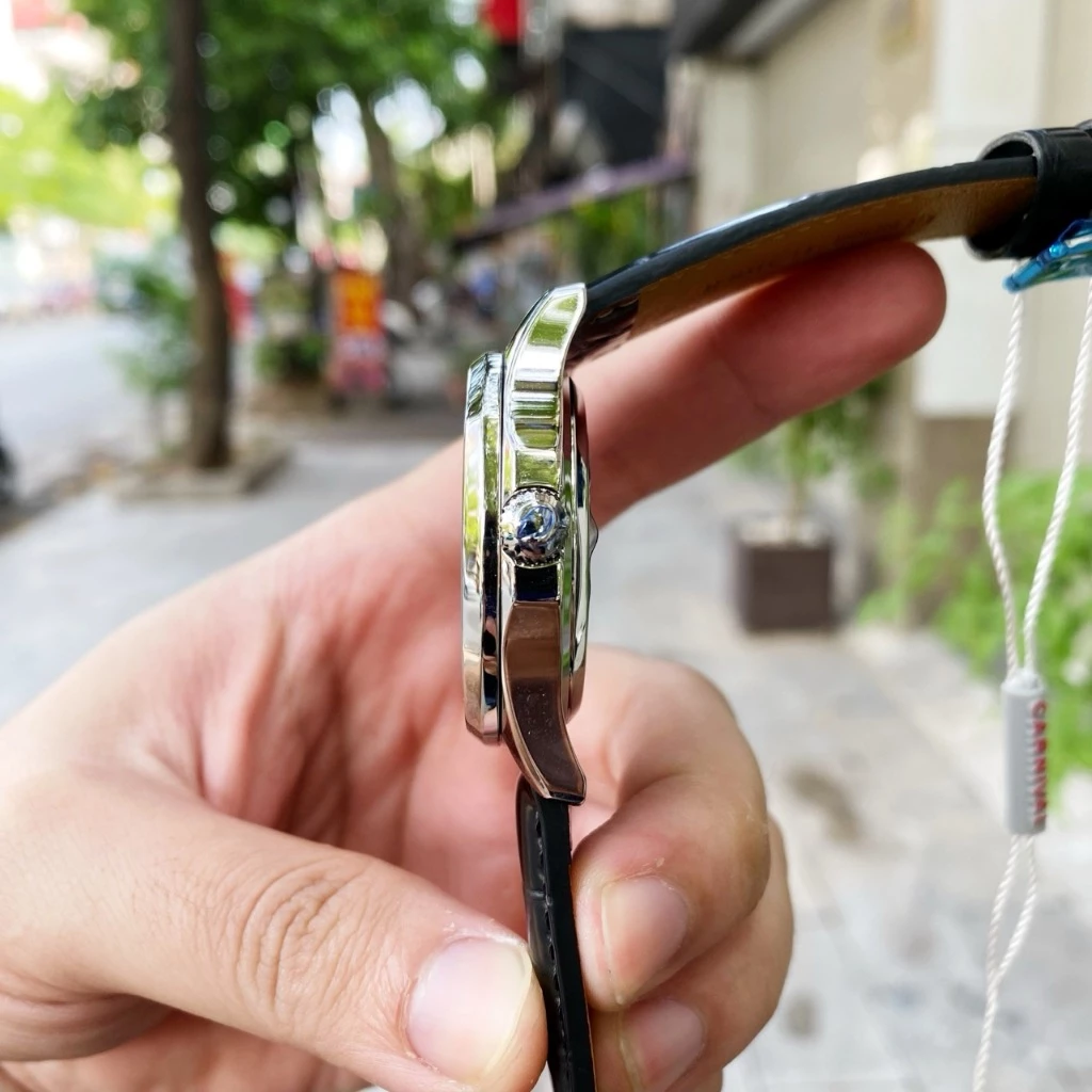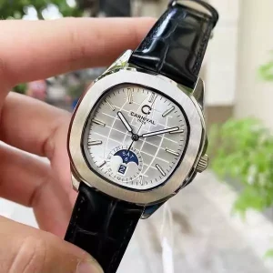 Đồng hồ nam chính hãng Carnival 8113 8113G Aquanaut vỏ trắng đính đá dây da máy cơ size 41mm