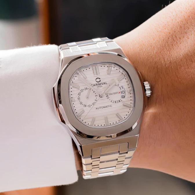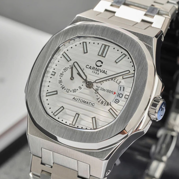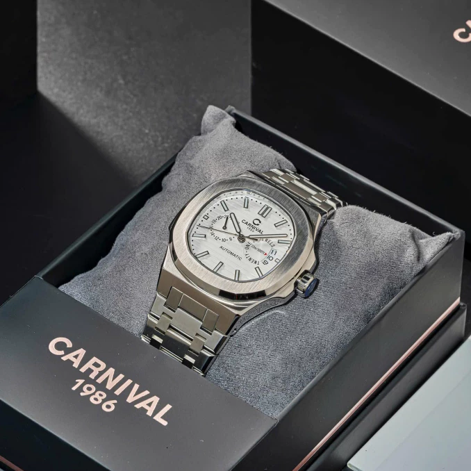Đồng hồ nam chính hãng Carnival 8158 8158G vỏ trắng dây thép máy cơ mặt kính sapphire nguyên khối