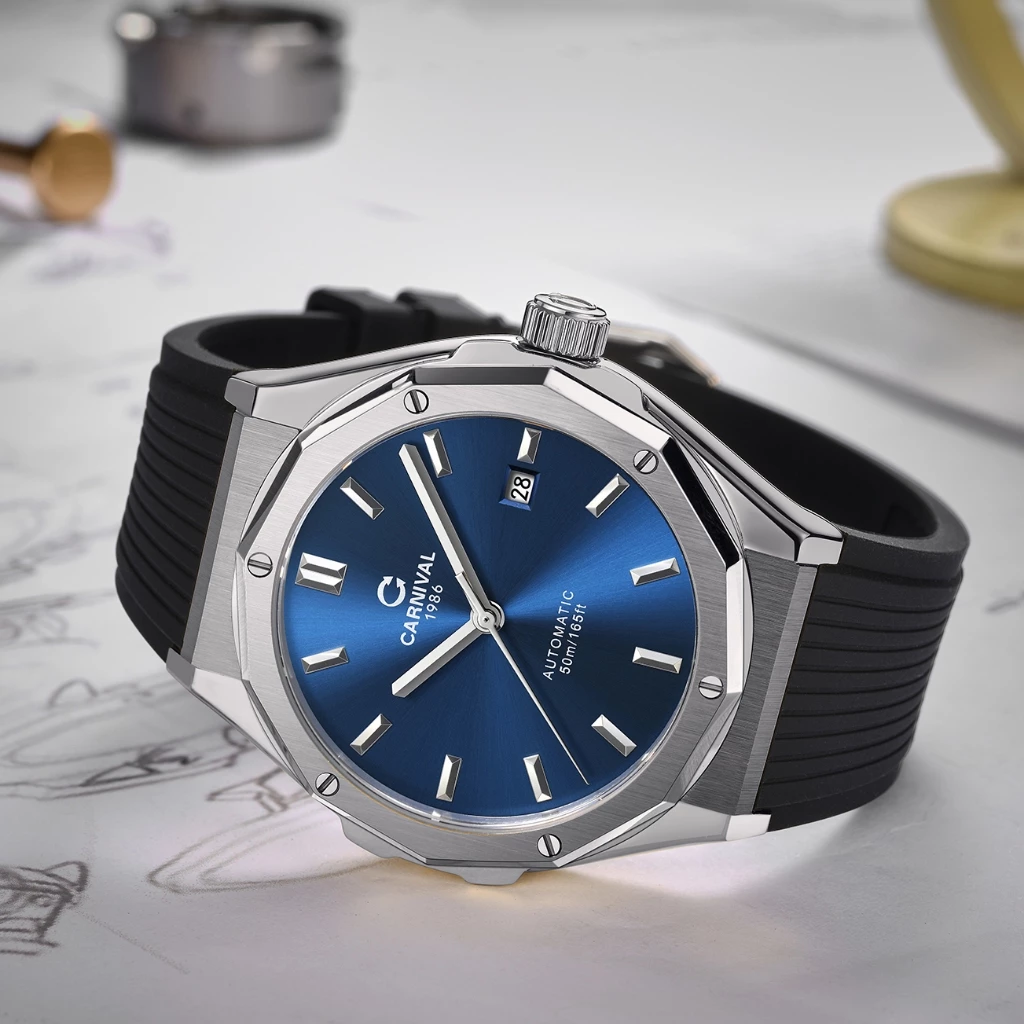 Đồng hồ nam chính hãng Carnival 8168 8168G vỏ trắng dây cao su máy cơ mặt kính sapphire size 42mm